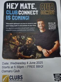 CLUB CONNECT: This seminar event is for all the community to help identify mental distress in family, friends, neighbors, work colleagues all within our community. Clubs NZ are travelling New Zealand with their Lean on a Gate seminar with Wiggy as their guest speaker, Join us Wednesday June 4th @ 5.30pm for a FREE BBQ and a chat, please support this event, see you all at 5.30pm with your crew.