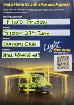 FLURO FRIDAY: 27 JUNE, we are supporting St John Oamaru to fundraise for their badly needed new station. We are hosting Fluro Friday starting 11am during the day so get your group together wear your fluro. Plenty of spot prizes, raffles, all proceeds go to the Oamaru rebuild. If you're not able to come and want to donate, please follow the link