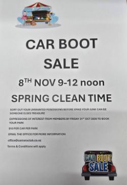 Just a few reminders for you all:CAR BOOT SALE: Saturday 8th November (next weekend) from 9am until 12 midday. If you are wanting to bring your unwanted items and clear some space for Xmas then contact the office and register your name. $ 10.00 per park, open to everyone. T&Cs apply