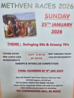 METHVEN RACES: as time ticks by all tickets must be paid for by Friday 9th (this week) by 4pm to secure your seat, $ 80.00 per person - 1st in best seat, great day out with lots of laughs, great food, drink and entertainment, so get in quick for a fantastic trip.